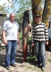 Ritvara Raita foto: Veiksmīgais makšķernieks Ivars Čerņonoks (no labās) un viņa palīgs Vasīlijs Skovins kopā ar izzvejoto milzu samu.
