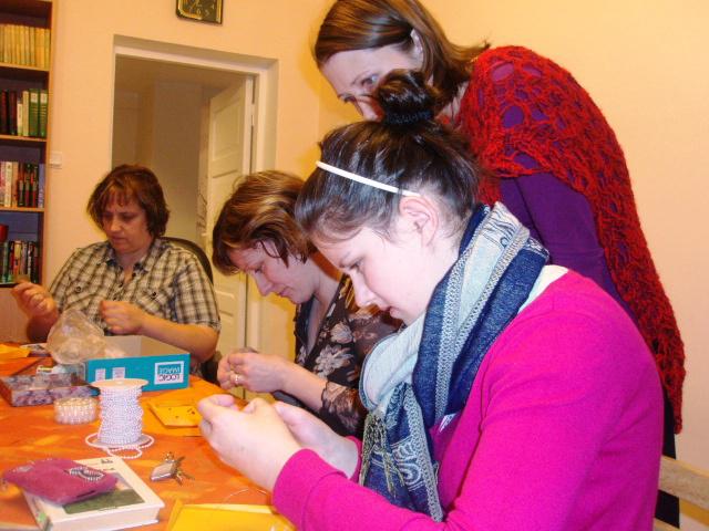 Vēlāk tika malkota tēja un iepazītas grāmatiņas par pērļošanu – „Pērlīšu virtenes”, „Burvīgas idejas rotām ar Swarovski kristāla pērlītēm”,”Stikla pērlīšu rotaslietas”, „Izsmalcinātas pērļu rotas” u.c.