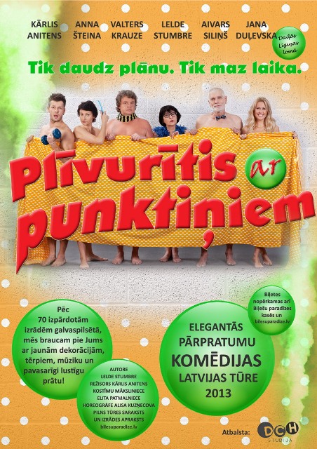 Droši vien šarmantajai Mijai dzīve liktos kā ziedoša pļava, ja vien sirdī nedurtos 40 gadus vecā dēla Artūra bohēmiskais dzīves veids. Droši vien Artūra bērnības draugam – sportiskajam Robertam izdotos savaldzināt skaisto Līgu, ja liktenīgajā vakarā blakus neapsēstos vecais, labais Baloža kungs. Droši vien drošsirdīgais Baloža kungs dabūtu Miju par sievu, ja vien Zane neradītu sazvērestības teoriju par dzīvokļa pārdošanu. “Plīvurītis ar punktiņiem” ir līdz asarām smieklīgs stāsts par kādu māti, kura ar “stingro roku” izaudzinājusi nekam nederīgu dēlu, taču sevī vainu neredz. Viņa rada ģeniālus plānus kā dzīvi izmainīt, bet, protams, viss notiek pilnīgi citādi. Biļešu cena Ls 3, 4, 5. |