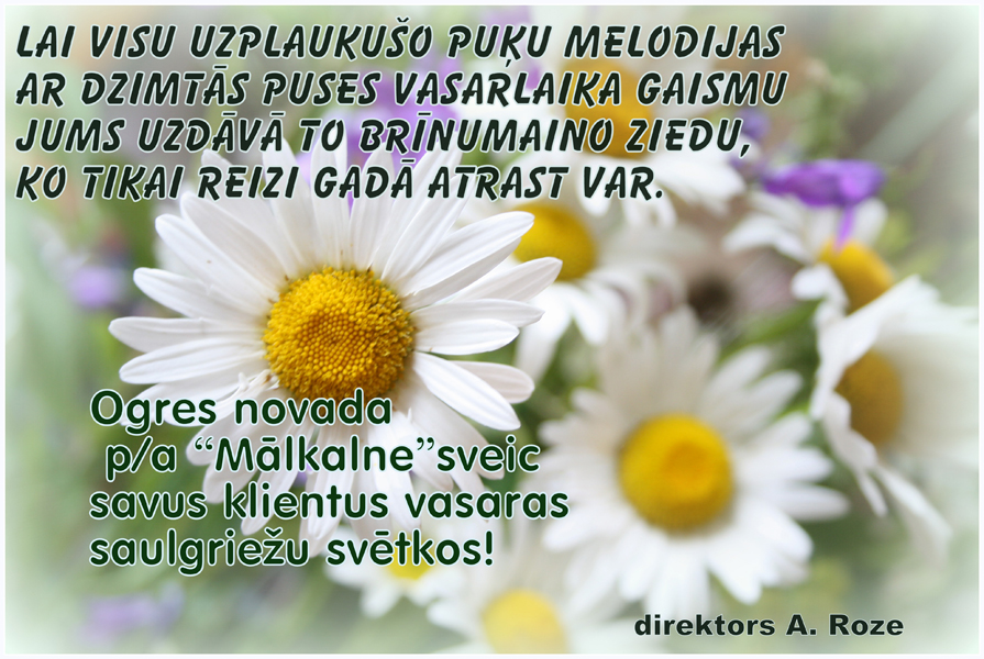 Ogres novada p/a "Mālkalne" sveic savus klientus vasaras saulgriežu svētkos!