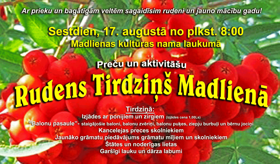 Sestdien, 17.augustā no plkst. 8, Madlienas kultūras nama laukumā notiks preču un aktivitāšu „Rudens tirdziņš”.