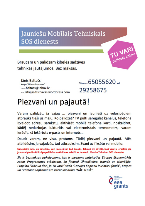 “Jaunieši pie Jums dosies tikai tad, kad būšu Jums piezvanījis atpakaļ un būsim sarunājuši konkrētu laiku, kad varam pie jums ierasties un būšu nosaucis Jums jauniešu vārdus, kuri pie Jums brauks. Pakalpojums ir bezmaksas un jebkuri citi cilvēki, kuri varētu ierasties pie jums vai piedāvāt līdzīgu palīdzību nekādi nav saistīti ar Jauniešu mobilo tehnisko SOS dienestu,” informē Jānis Baltačs.