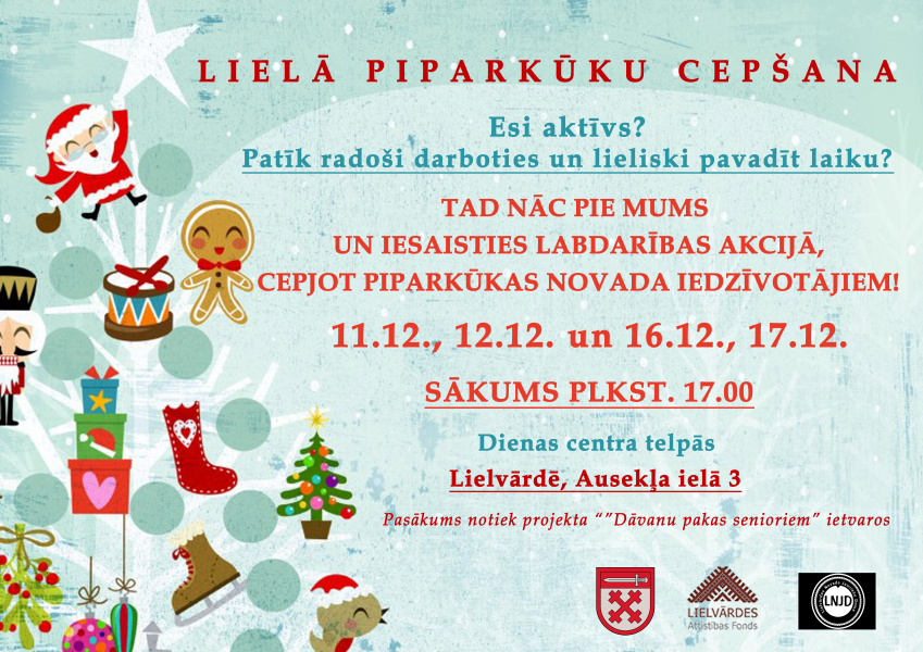 11., 12., 16., 17. decembrī no plkst. 17.00 Dienas centra telpās, Ausekļa ielā 3, Lielvārdē, kā arī palīdzot izdalīt pārtikas pakas 20.decembrī.
