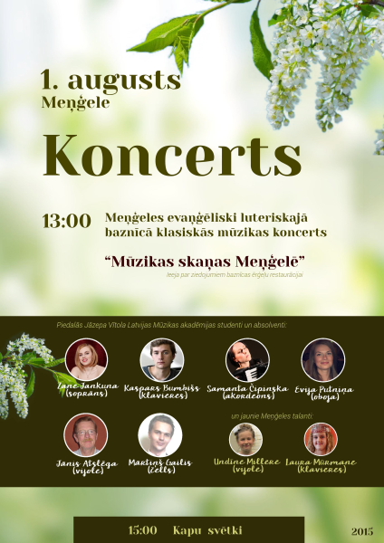 1.augustā plkst. 13:00 Meņģeles evaņģēliski luteriskajā baznīcā notiks klasiskās mūzikas koncerts “Mūzikas skaņas Meņģelē”. Koncerts notiek apstiprinātā Ogres novada pašvaldības projektu konkursa “Radoši – Aktīvi – Darbīgi – Izglītojoši – Ogres novadam!” ietvaros.