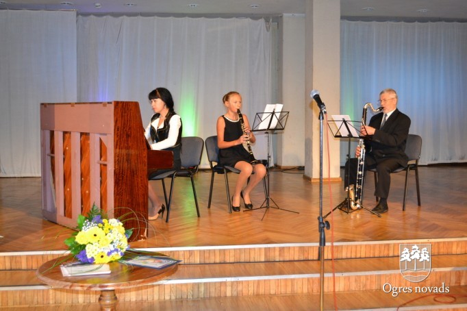 Ar muzikālu sveicienu pie pensionāriem bija ieradušies Ogres Mūzikas skolas audzēkņi, kā īpašs sveiciens jubilejā izskanēja A.Manguļa un Ogres Mūzikas skolas direktora p.i. Aivara Krancmaņa duetā dziedātās dziesmas.