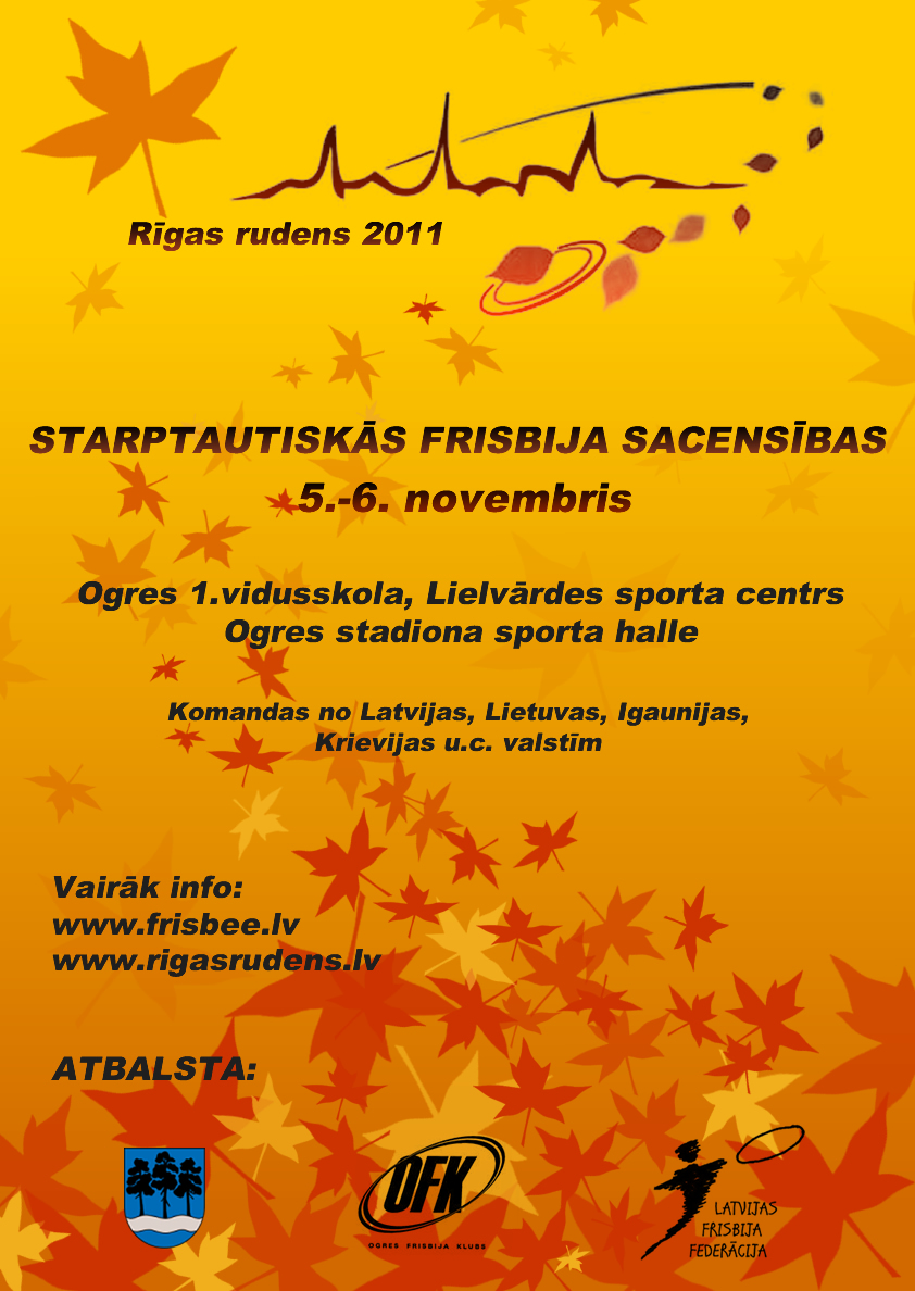 Ogrē 5.-6.novembrī notiks ikgadējais starptautiskais frisbija turnīrs Rīgas Rudens. Šogad tajā piedalās 29 komandas, kas pārstāv Latviju, Zviedriju, Krieviju, Lietuvu un Igauniju.
